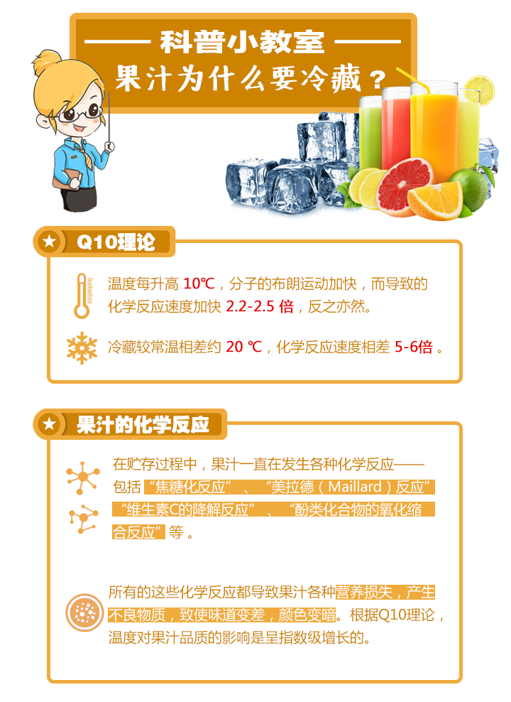 在超市中通常有常溫果汁和冷藏果汁兩種果汁飲料。常溫果汁保質(zhì)期都很長,生產(chǎn)過程中需要經(jīng)過高溫長時(shí)間的殺菌,這往往會對營養(yǎng)造成破壞;冷藏果汁保質(zhì)期較短,采取短時(shí)間的適度殺菌,通常能保留較多的營養(yǎng)成分。