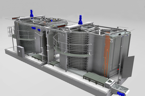 結(jié)構(gòu)設(shè)計更適合現(xiàn)代化生產(chǎn):單螺旋速凍裝置的進、出料口只能分上進下出或下進上出兩種形式,而雙螺旋進、出料口都在下面,進、出料方向的選擇也更加靈活,更容易與其它配套設(shè)備組合,實現(xiàn)現(xiàn)代化流水線生產(chǎn)。